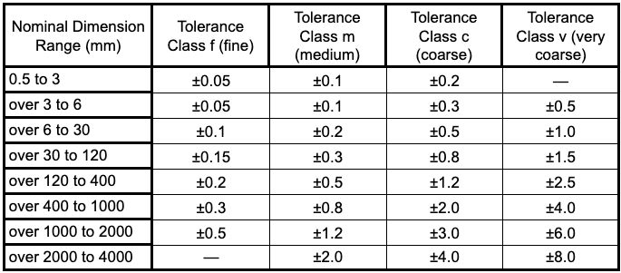 Most engineering drawings include a block that defines allowable tolerances for all untoleranced dimensions - general tolerances. With ISO standards, it's commonly ISO 2768 with a specification about the tolerance class that applies. General tolerances can define tolerances for linear dimensions (like the table above), angular dimensions, straightness and flatness, perpendicularity, etc.